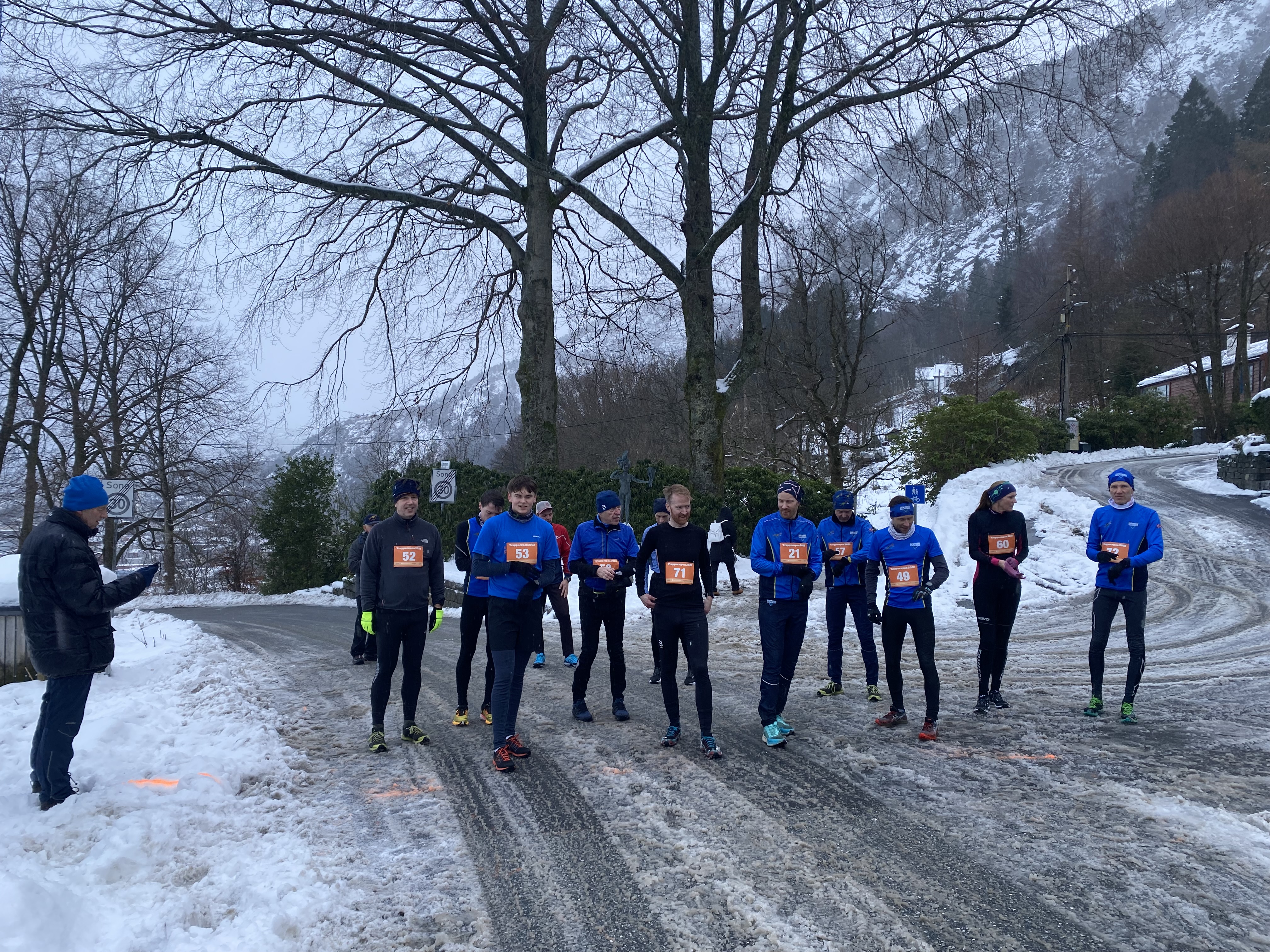 Denne ukens vintervær preget underlaget. Tidvis var det løst og noe forsiktighet var påkrevd i utforløpingen fra Skansemyren og ned til Fjellveien. Stian Angermund var ikke uventet den raskeste. Han sprang runden på 19:26. De som fulgte tettest var Stein Henrik Olaussen og Trygve "terskelmagen" Andresen. Rutinerte og velkjente Hanne Liland var den raskeste i kvinneklassen. Hun ble imidlertid tidsmessig utmanøvrert av unge og lettbeinte Aurora fra Åsane.