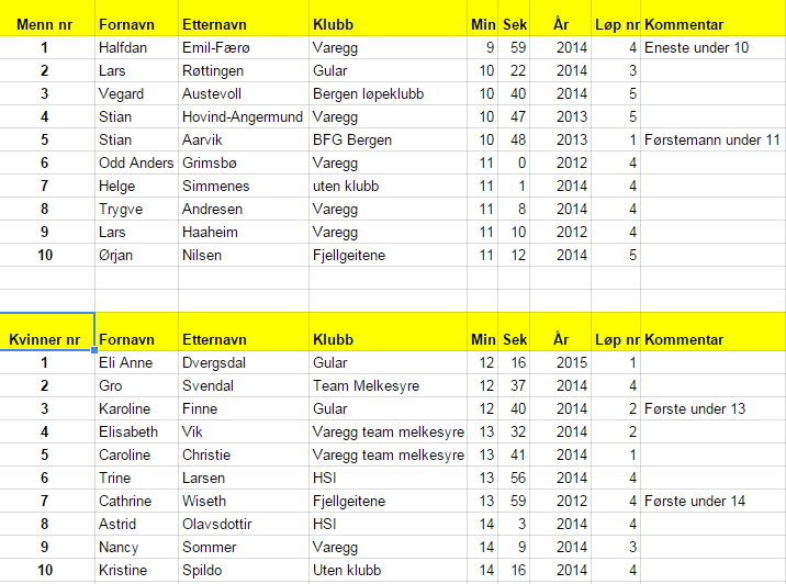 Eli Anne Dvergsdal åpnet motbakkesesongen 2015 med å sette ny løyperekord fra Fjellveien til Fløyen. Herrevinneren Trygve Andresen har dykket ned i gamle resultatlister og laget "Fløyenkarusellens 10 på topp".