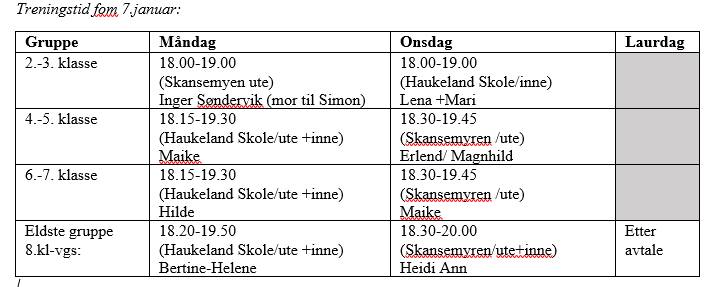 • Oppstart måndag 7.januar med vanleg trening etter planen under. Merk at me har utvida tilbod for 2.-3.kl på Skansemyren om måndagene. Inger Søndervik har hovudansvar her, men om fleire har anledning til å hjelpe kan dei ta kontakt med ho.