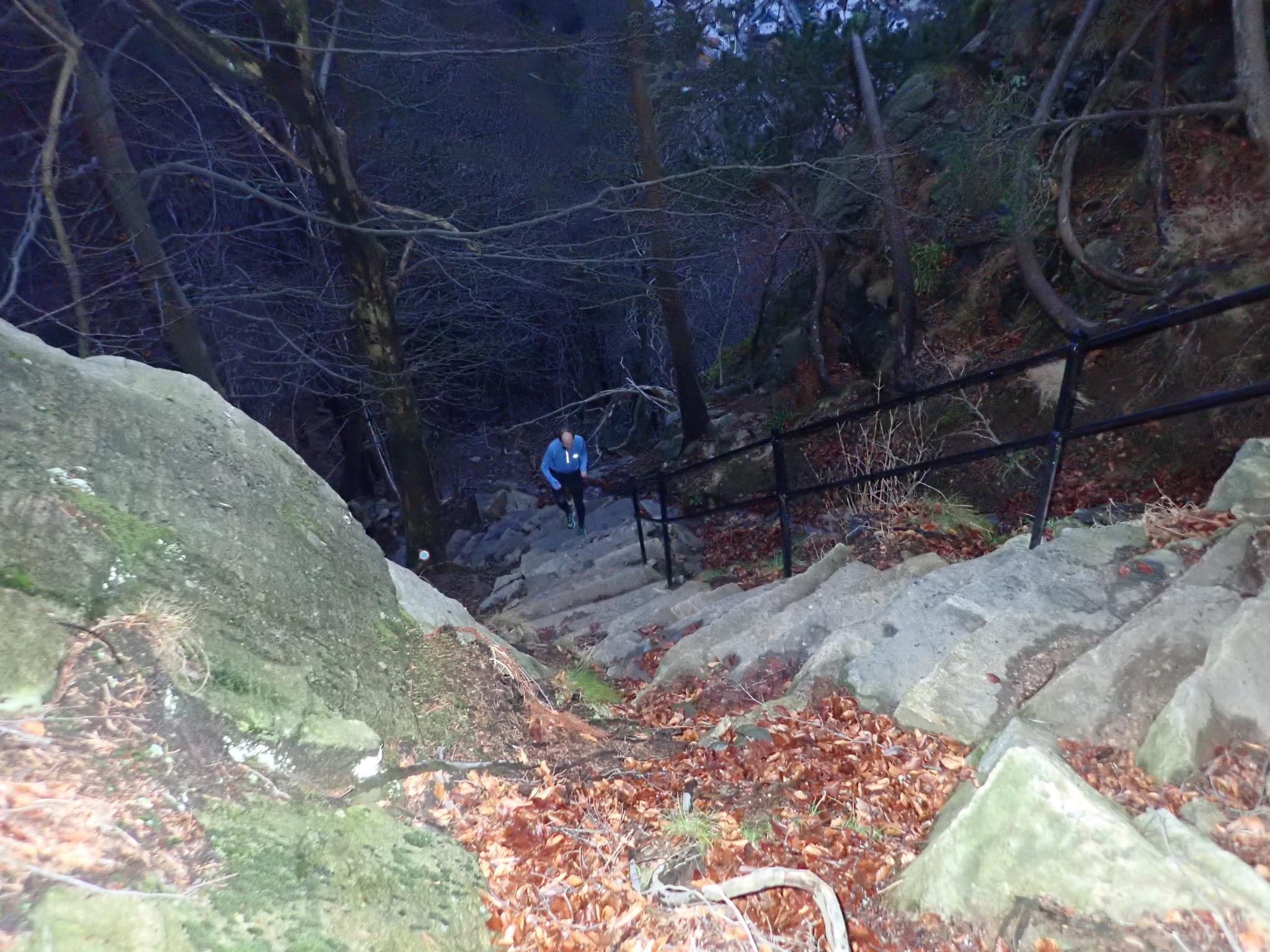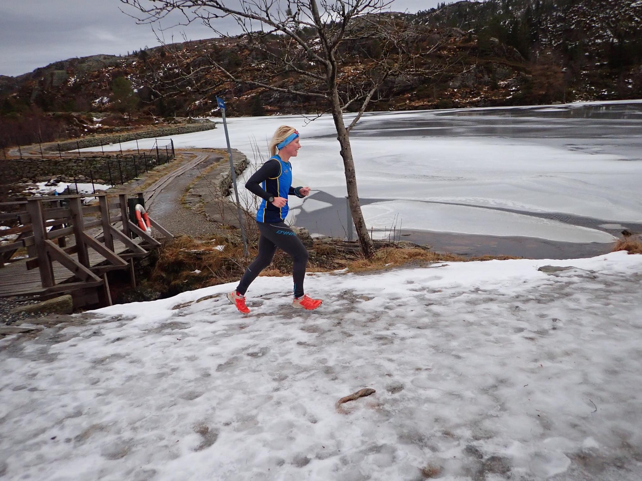 Stian Angermund og Katrine Villumsen var ikke uventet de to raskeste. Begge løp på blanke sko. Katrine måtte stykkevis holde så lav fart at det ble litt kaldt på fjellet. Det var mye løping i grøftene og åpent terreng langs de glatte veipartiene. Løperne meldte ellers om en god gjennomkjøring etter hard løping oppover og en leken avslutning fra Fløypilen og ned.