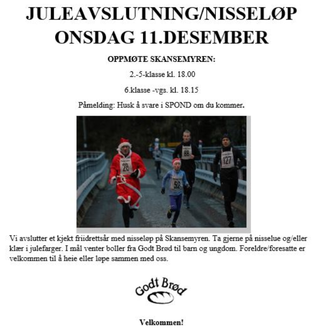 Onsdag 11. desember runder vi av før Jul med Nisseløp på Skansemyren.
