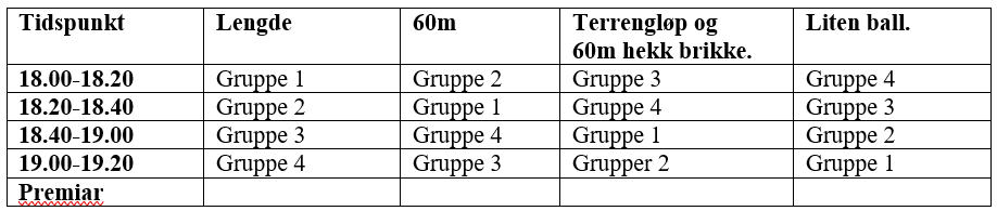 På onsdag arrangerer me klubbmeisterskap på Skansemyren for alle gruppar. Tanken er at alle skal få anledning til å prøve ulike friidrettsøvingar. Trenarane følgjer gruppane rundt på stasjonane. Blant alle deltakarane trekkes det ut litt premiar til slutt. Vel møtt!