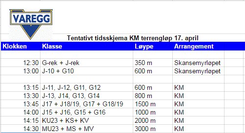 Endelig tidsskjema gjøres kjent på varegg.no fredagen før løpsdagen.