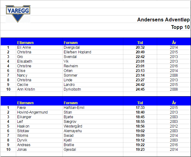 Andreas Bratlie var dagens raskeste løper. Vareggløperen ble klokket inn på 19:22. Tiden står seg til en 9. plass på Andersens 10-på-topp-liste. Bak Andreas stormet unggutten Markus Kjærner-Semb inn til 19:45. Børge B. Larsson kapret tredjeplassen med 19:55.