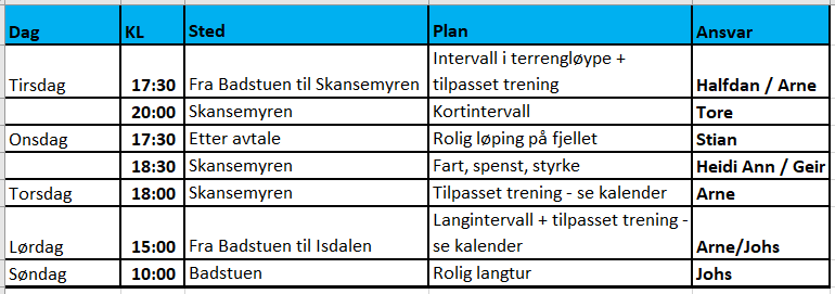 - Alle planer for treningsøktene skisseres grovt i aktivitetskalenderen. Det er derfor mulig å komponere gode individuelle treningsopplegg om tid og sted ikke skulle passe hver gang.