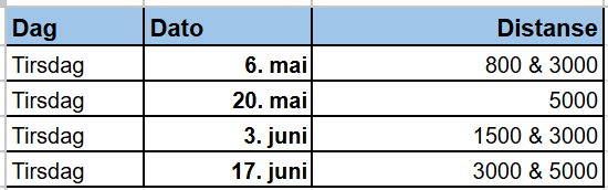 Dato og distanser for vårens Skansemyren Banekarusell.