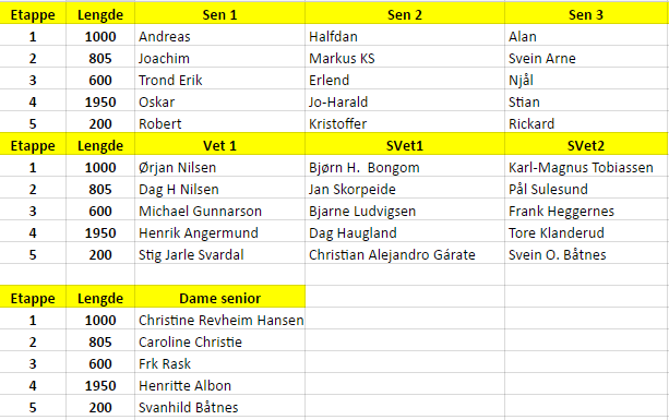 Geir skriver i en liten pressemelding: "Da er forslag til lag vedlagt, ingenting er «hugget i stein» så bare kom med tilbakemeldinger hvis du føler at etappen kanskje ikke er noe for deg. Start kl 19.15, så ber om at dere møter senest 18.15 på Fana Stadion, så har dere god tid til oppvarming og en liten prat omkring veksling.Hvis noen ikke kan stille, ta kontakt så raskt som mulig. Tlf. 456 65 687 eventuel på epost til gelindb@online.no"