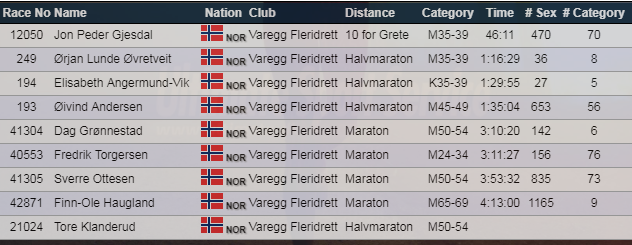 På maraton viste Dag Grønnestad ryggen til den unge fighter Fredrik Torgersen. Fredrik tok ut alt og lå strykeflat i målområdet, og skal ha fått væske intravenøst for å få tilbake sitt sedvanlige gode humør. Solid maraton-innsats også av orienteringsnestoren Sverrre og lettbeinte Finn-Ole.