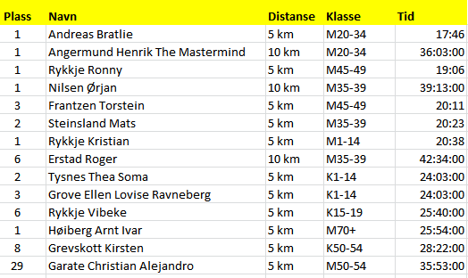 Nykommeren Andreas Bratlie viste tæl og holdt rask takt på den korte distansen. Med 17.46 holdt friskusen konkurrentene på trygg avstand. Henrik Angermund rapporteres å holde en stram regi på treningen, og han bekreftet styrke med seier på 10 kilometeren. Tiden 36.03 sto seg med god margin ned til den jaktende løperen fra Gular. Vi noterer også klasseseire og topp tre plasseringer på en rekke av vareggløperne.