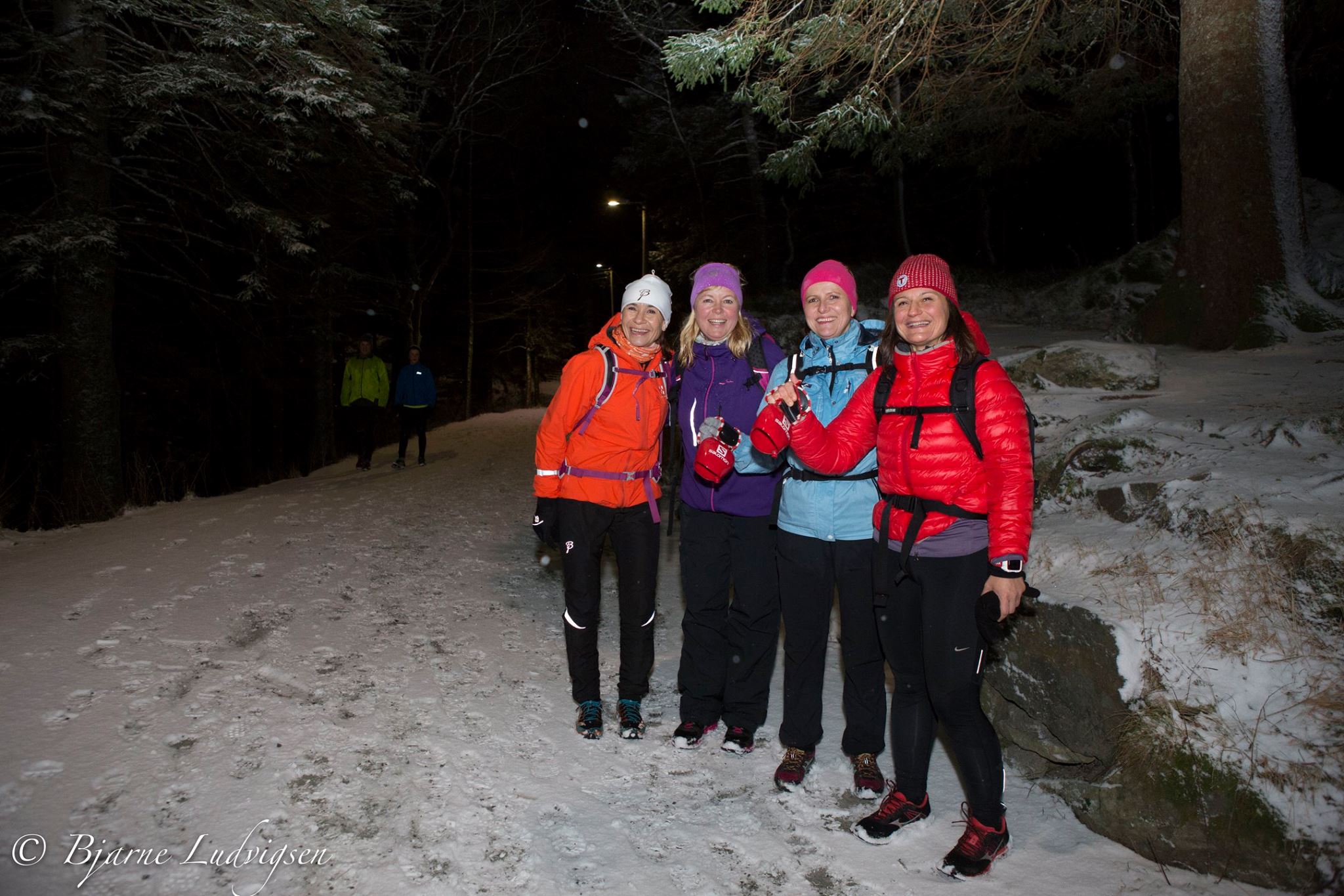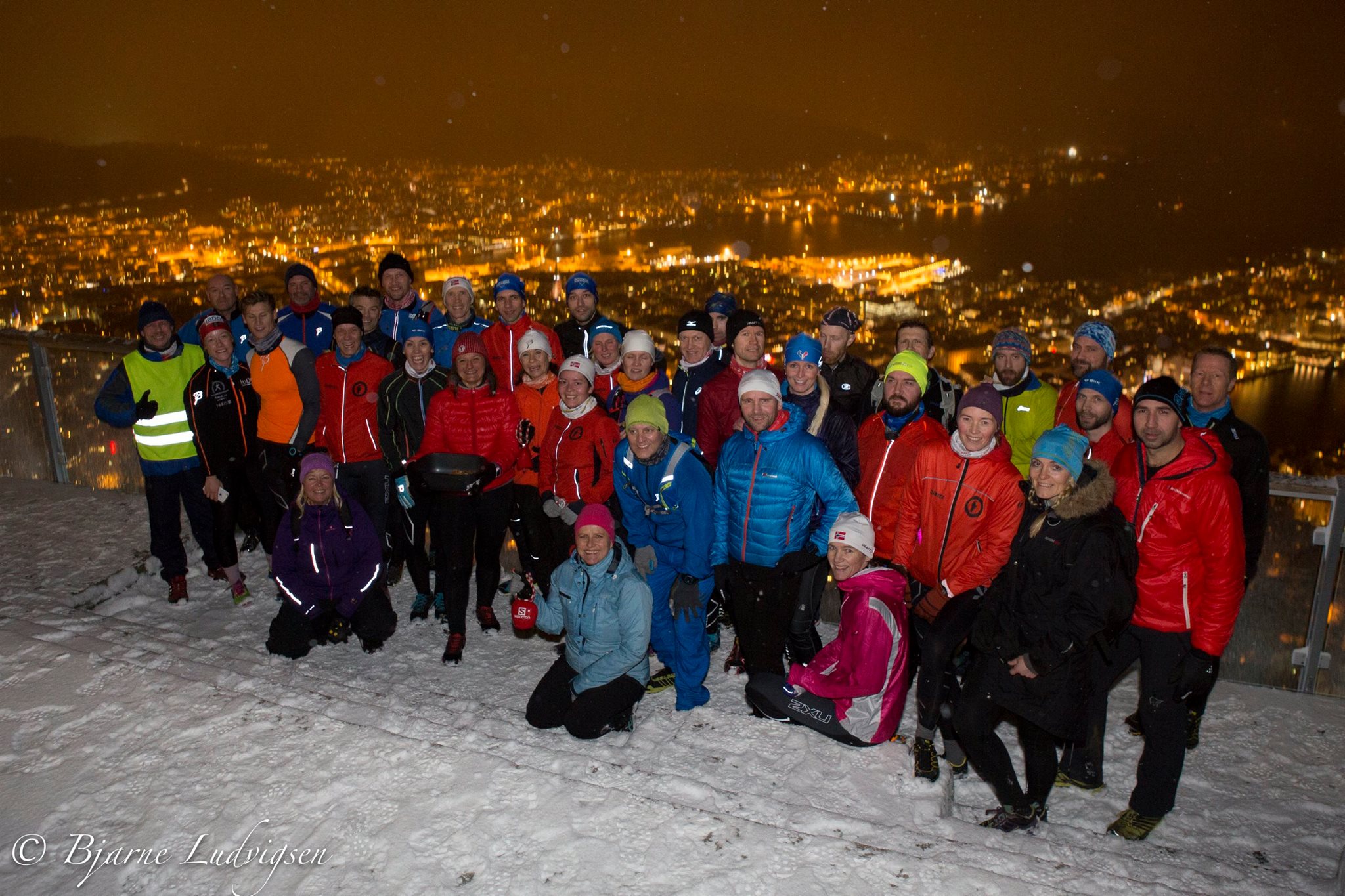 Arrangøren gleder seg over ny deltaker-rekord. Drøyt hundre løpere kom seg raskt fra Fjellveien til Fløyen. Der ble de møtt av en strålende heiagjeng. De fire blide dame bød på heiarop, ringing med kubjeller og en styrkende kakebit.