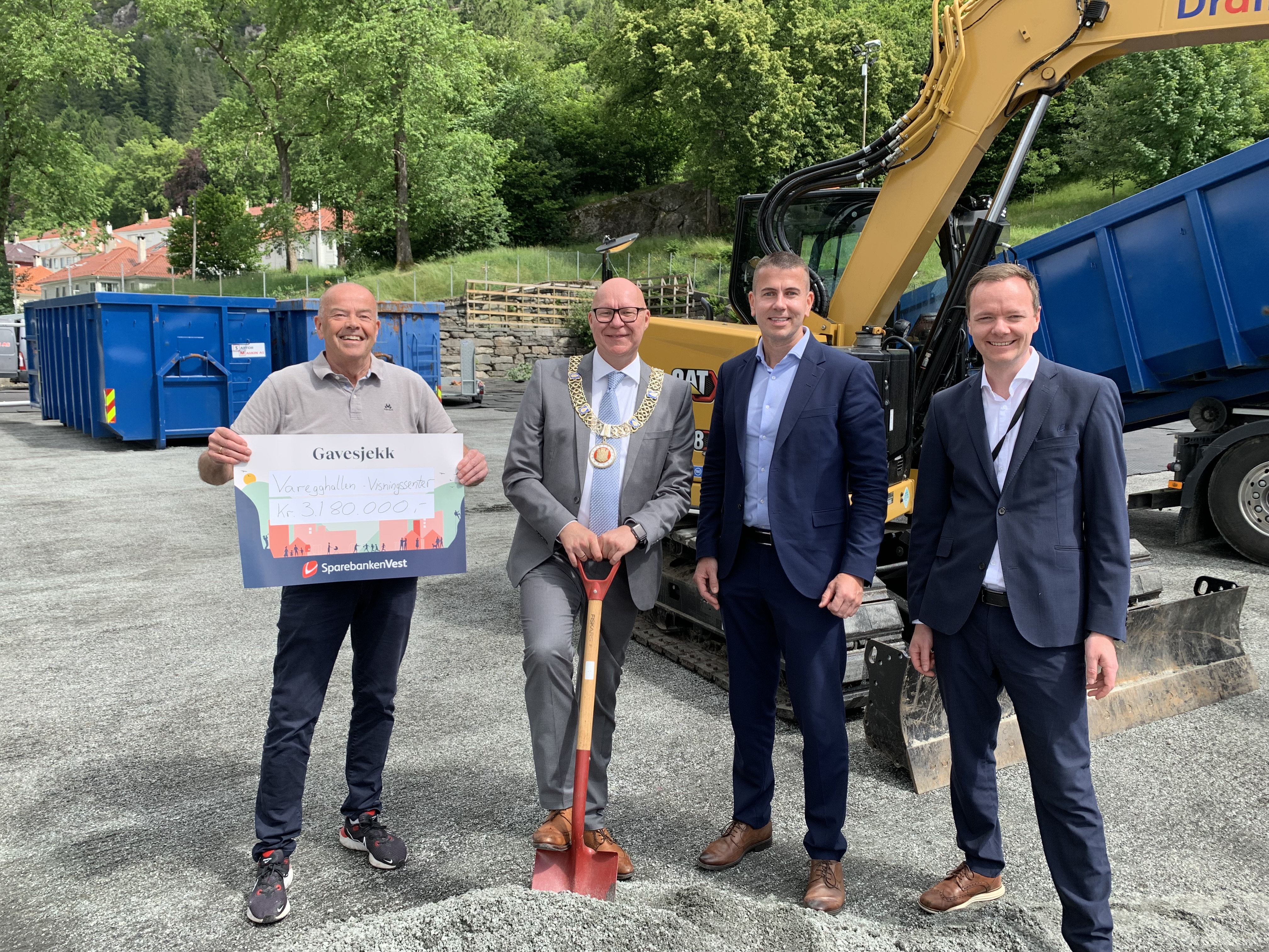 Etter blomsteroverrekkelse, med takk til Bergen kommune for tomt og reguleringsplan, gjøres det klart for første spadetak med formell oppstart av byggearbeidene. Fra venstre Ola B. Siverts, Børge Alvheim, ordfører Rune Bakervik og Stein Harald Arnesen.
